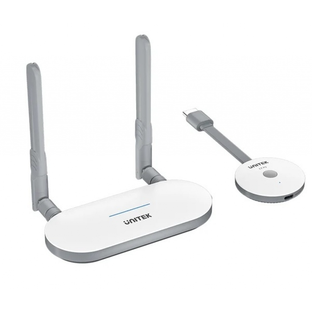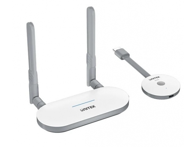 El kit transmisor y receptor HDMI inalámbrico de UNITEK permite la transmisión hasta 50 metros, lo que permite transmitir fácilmente la pantalla desde dispositivos HDMI a pantallas sin cables para una experiencia confiable y conveniente.