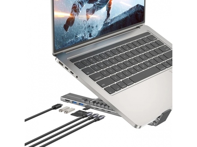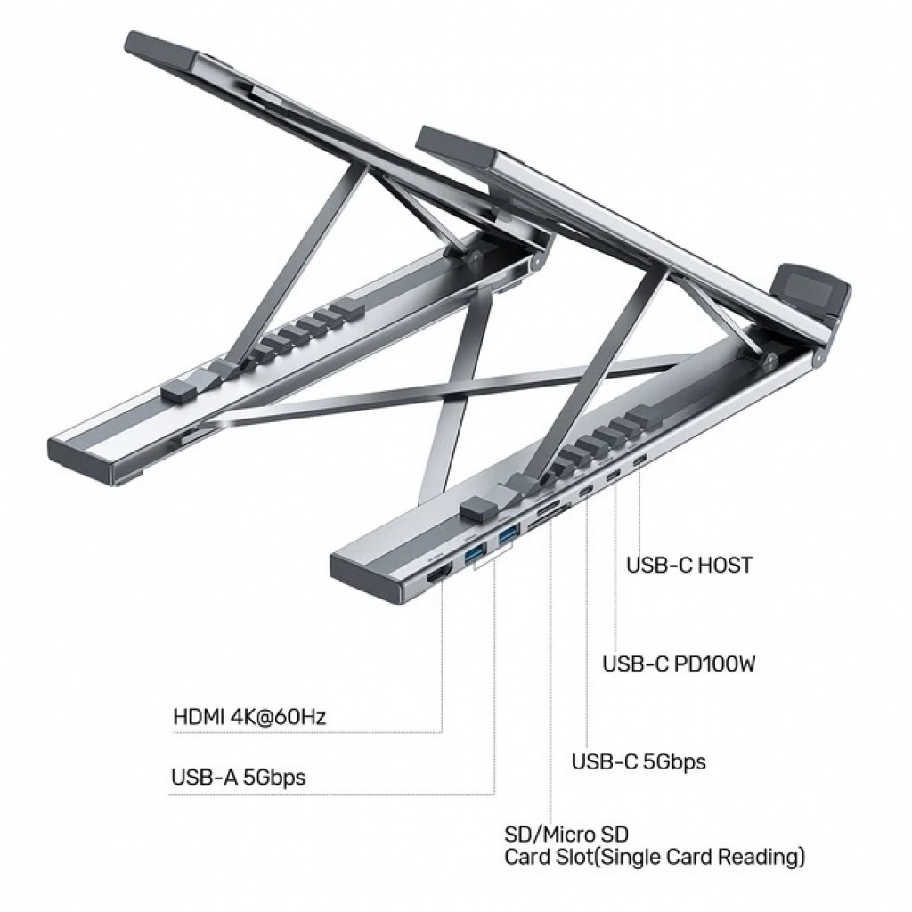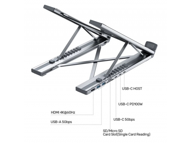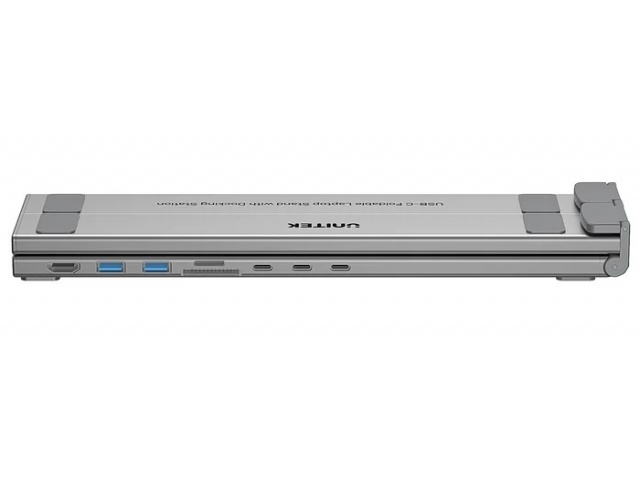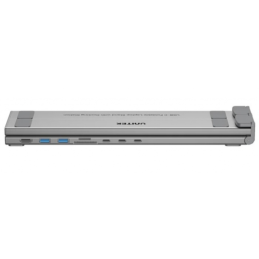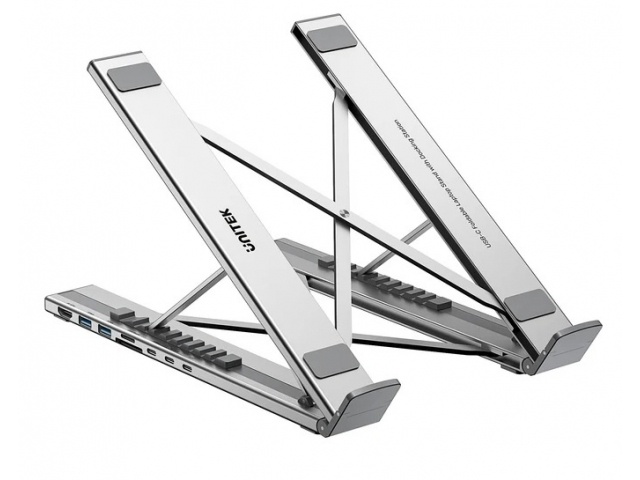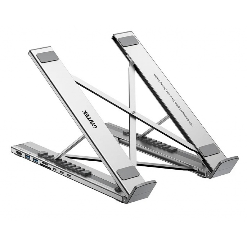 El soporte plegable para portátil UNITEK USB-C con estación de acoplamiento ofrece estilo y funcionalidad. Cuenta con una salida para monitor 4K a 60 Hz, dos puertos USB-A de 5 Gbps y un puerto USB-C para una rápida transferencia de datos. Con 100 W de potencia y un lector de tarjetas SD/MicroSD, este soporte plegable para portátil con estación de acoplamiento mantiene tus dispositivos cargados y conectados, ideal para la productividad en movimiento.
