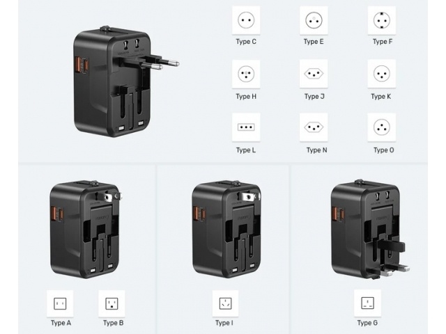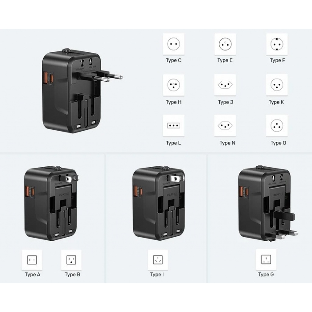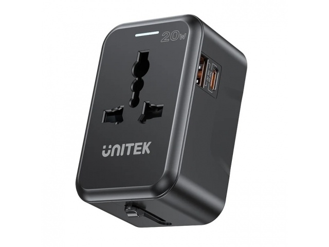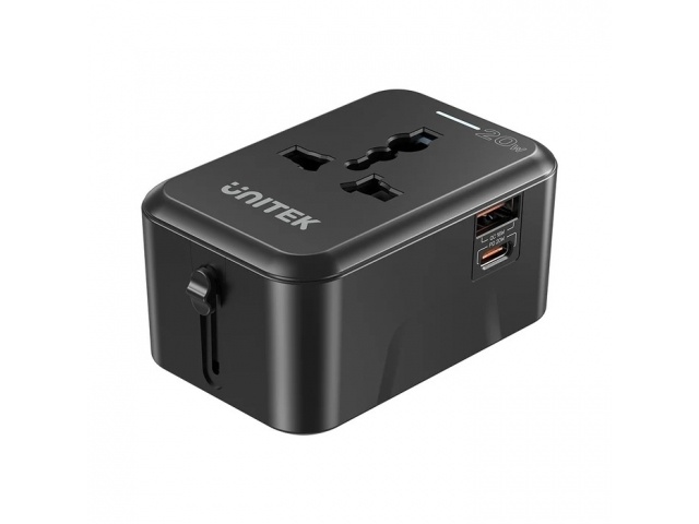 Adaptador de viaje universal UNITEK de 20 W con 1 puerto de carga USB-C PD (máximo 20 W) y 1 puerto de carga USB-A QC 3.0 (máximo 18 W) que puede cargar hasta 2 dispositivos simultáneamente. Es ideal para viajes, viajes de negocios o para estudiar en el extranjero. Tiene tomas de corriente integradas para JP/US, AU, EU y UK que se pueden utilizar en más de 200 países de todo el mundo.