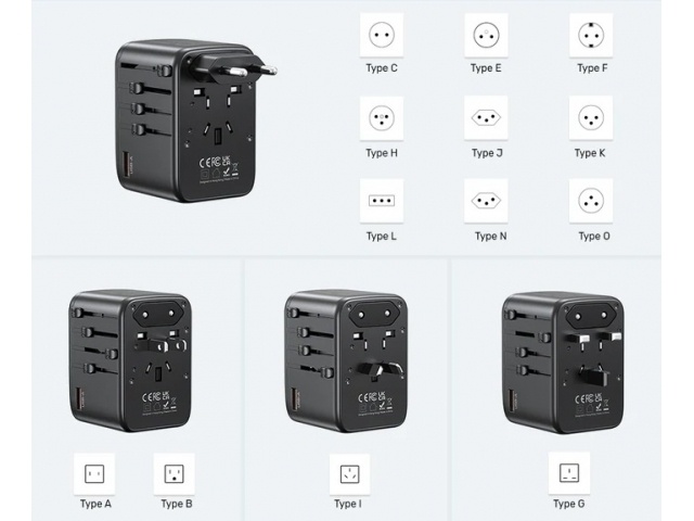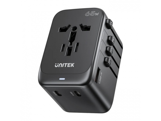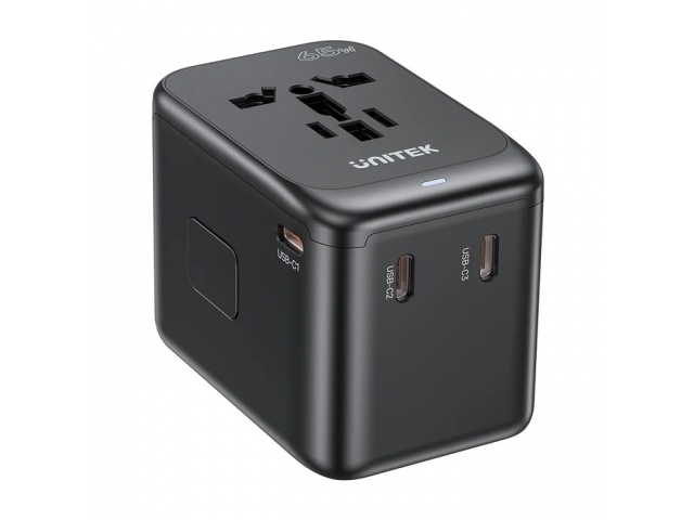Adaptador de viaje universal UNITEK de 65 W con 3 puertos de carga USB-C PD (máximo de 65 W) y 1 puerto de carga USB-A QC 3.0 (máximo de 45 W) que puede cargar hasta 4 dispositivos simultáneamente. Es ideal para viajes, viajes de negocios o para estudiar en el extranjero. Los enchufes de viaje integrados se pueden utilizar en más de 200 países de todo el mundo.