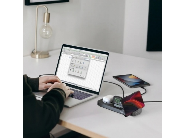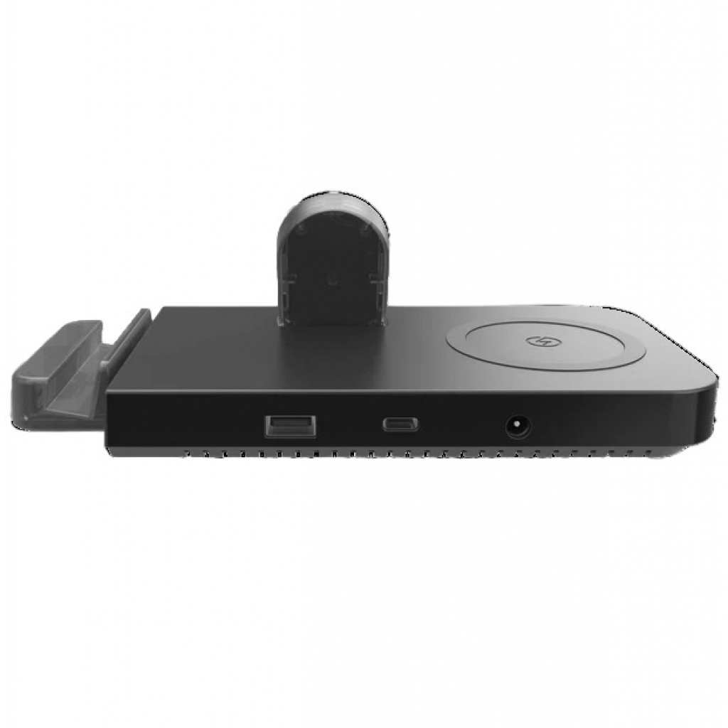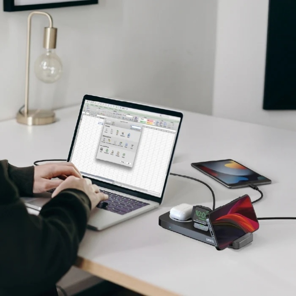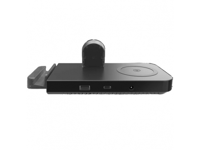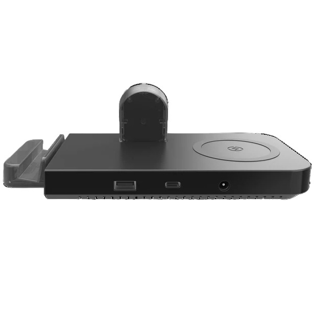 Estación de carga modular y multifuncional que puede cargar 5 dispositivos simultáneamente. Hay 3 áreas de carga inalámbrica para su teléfono inteligente, reloj inteligente y auriculares inalámbricos. La plataforma de carga también cuenta con 1 puerto USB-A y 1 puerto USB-C para cargar su tableta y otros dispositivos.